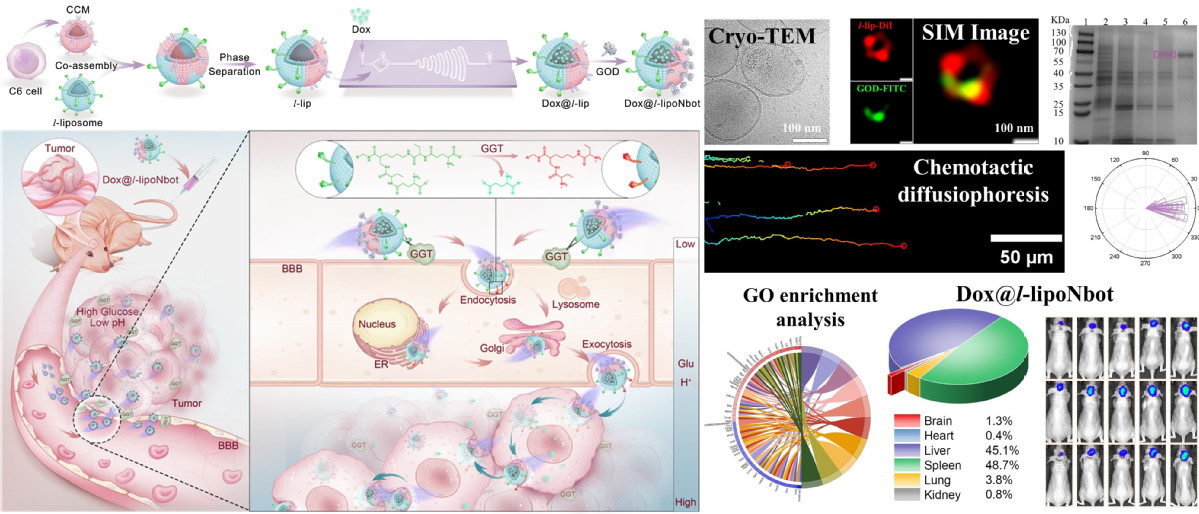 脑胶质瘤作为中枢神经系统最具侵袭性和致命性的肿瘤类型之一,临床治疗效果尚不理想。当前治疗面临的主要难题在于血脑屏障及错综复杂的肿瘤微环境共同构成了药物递送的“顽固堡垒”,使得常规药物和纳米药物均难以精准靶向病灶区域,严重限制了临床疗效。针对这一关键问题,研究团队从肿瘤微环境特有的质子与γ-谷氨酰转移酶过表达等关键生化特征中汲取灵感,创新采用多层级分子组装策略,实现了Janus结构自寻的脂质体纳米机器人批量构筑。该纳米机器人的一侧修饰酶驱动模块,催化内源性葡萄糖分解实现自主推进,感知肿瘤微环境中质子梯度并向病灶中心定向迁移;另一侧经γ-谷氨酰化修饰,能特异性识别并结合于血脑屏障和肿瘤细胞高表达的γ-谷氨酰转移酶,原位生成带正电伯氨基,进而触发吸附介导的转胞吞作用,并通过“质子海绵效应”实现高效溶酶体逃逸,最终成功突破血脑屏障与肿瘤微环境的多重封锁。活体实验表明,该脂质体纳米机器人显著提升药物递送效率4倍以上,有效延长中位生存期,并表现出良好的生物安全和低毒特性。